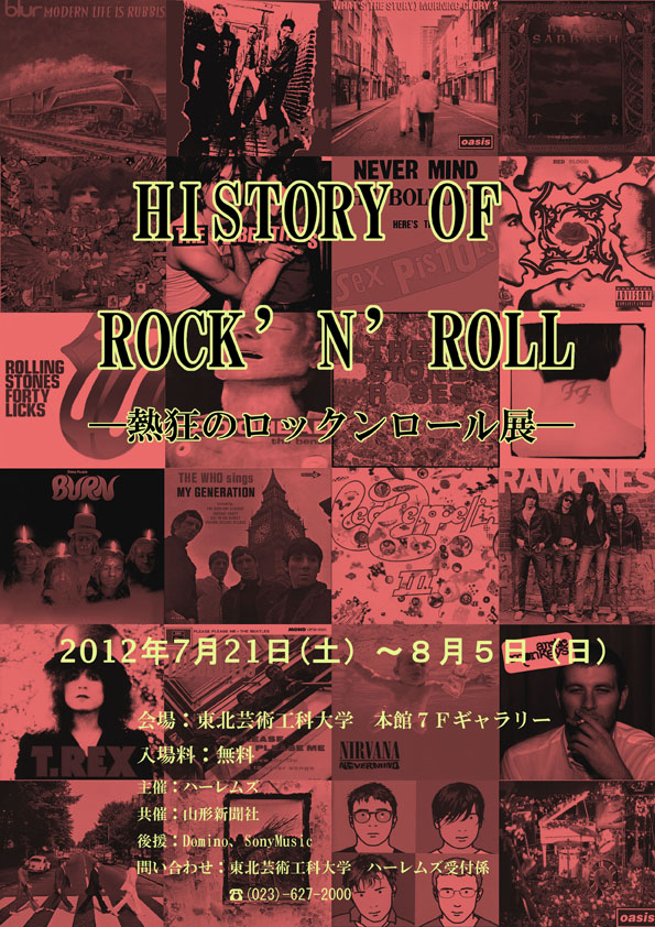 半世紀前に産声を上げ、世界各国で大勢の人々に愛されるロックンロール。そんなロックンロールの歴史にスポットを当てた「HISTORY OF ROCK’N’ROLL」が東北芸術工科大学の7Fギャラリーにて開催。本企画展ではCDジャケットやパネル紹介をはじめ、有名ギタリストのギターなどの展示も満載。世代を超えたレジェンド達のコラボレーションを是非ご覧ください。
