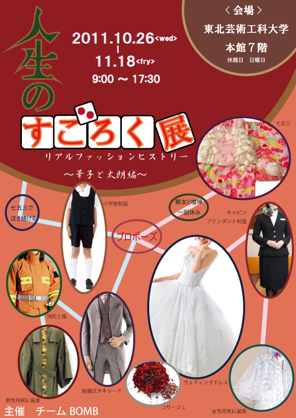 この展示企画は、「名古屋華子」と「山形太朗」という架空の二人の人物の人生を辿っていく、というテーマで配置されています。正反対の魅力を持った二人は大学で出会い、やがて付き合い始めます。就職で太朗は消防士、華子はキャビンアテンダントになり一度は離れ離れになってしまいますが、遠距離恋愛を乗り越えて晴れて結婚、子宝にも恵まれ幸せに暮らす・・・というのが本来のストーリーです。しかしすごろくで出た目によって起きるイベントも変化するので、二人の波乱万丈な人生を正反対の二人が別々に生まれ、出会い、共に生きていく波乱万丈な人生をこの展示から覗いてみてください。