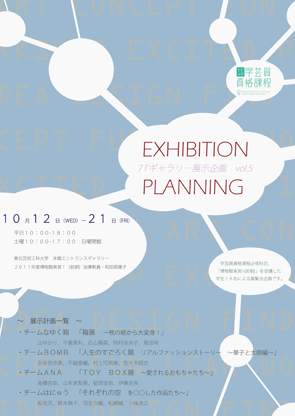 2011年前期の「博物館実習1」を受講した18名(月曜3,4時間目9名、および5,6時間目9名)による成果発表の展示です。