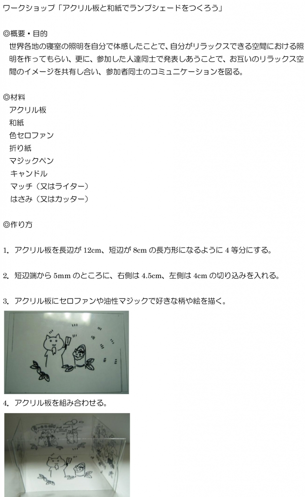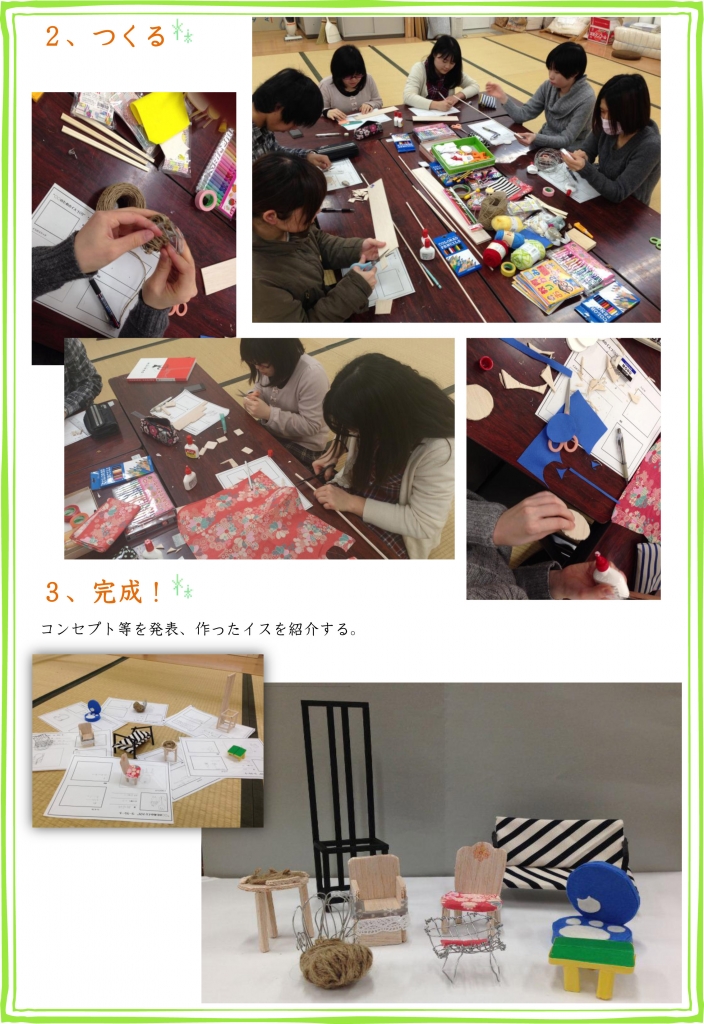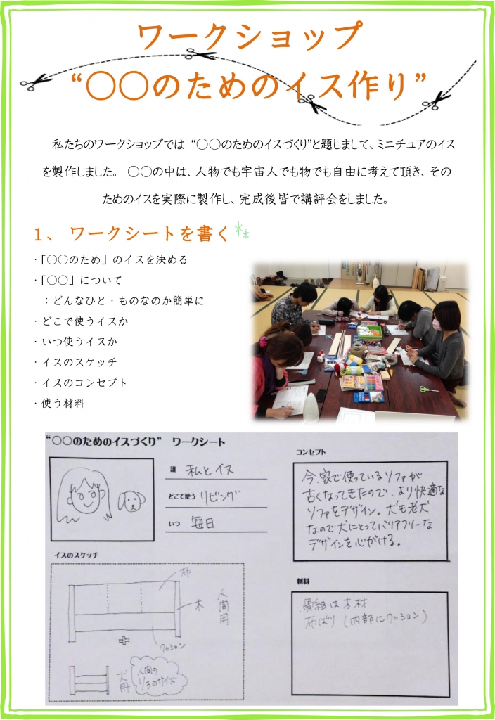 ミニチュア椅子、キャンドルホルダーなど、展覧会内容に即したプロダクトデザインの制作、および「もしものとき」に必要な防災ずきんを、身近なバスタオルで制作するなど、ものづくり系のワークショップがや多いのが特色です。誕生に関する企画は、「生まれ変わった出来事」についてカードづくりを行い、参加者全員で発表しあうコミュニケーション型のワークショップを行いました。