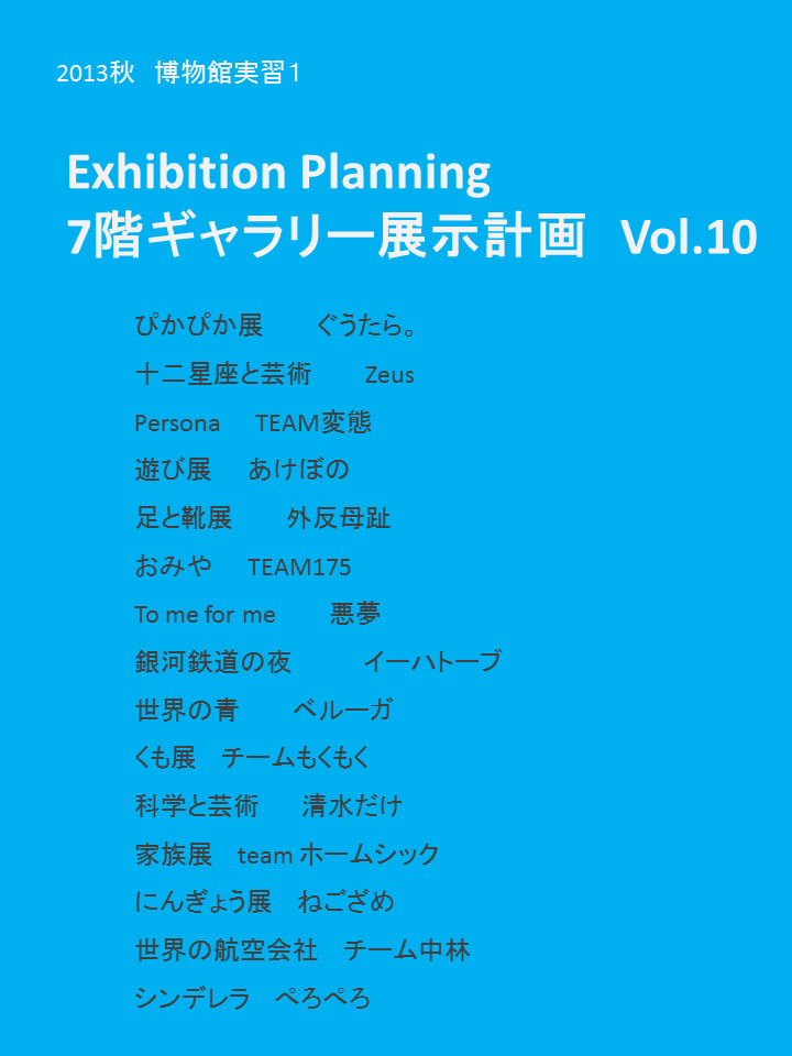 「ぴかぴか展」 ぐうたら。 / 「十二星座と芸術」zeus / 「persona 」 team変態 / 「遊び展」あけぼの / 「足と靴」外反母趾 / 「おみや」team 175 / 「to me for me」悪夢 / 「銀河鉄道の夜」イーハトーブ /「世界の青」ベルーガ / 「くも展」 チームもくもく / 「科学と芸術」清水だけ / 「家族展」team ホームシック /「にんぎょう展」ねござめ / 「世界の航空会社」チーム中林 / 「シンデレラ」ぺろぺろ