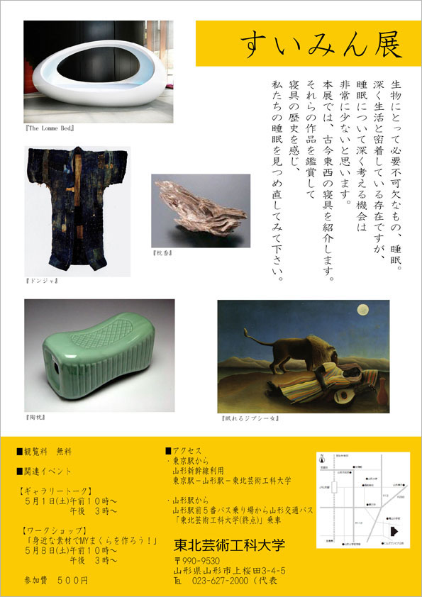 生活と深く密着している睡眠。それについて、もういちど見つめ直す企画です。展示では古今東西の寝具を集め、それにまつわる展示を行います。