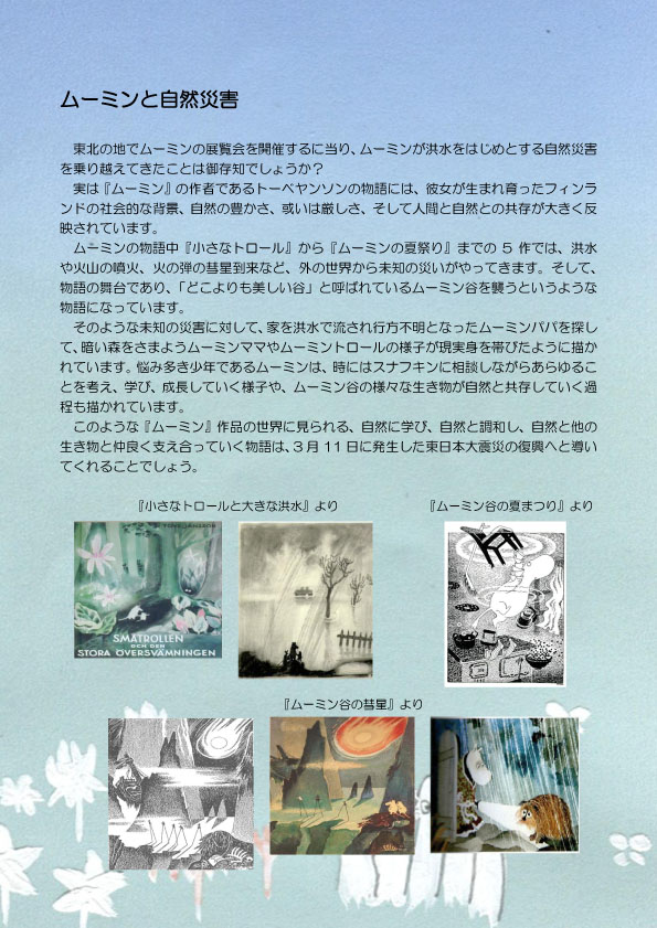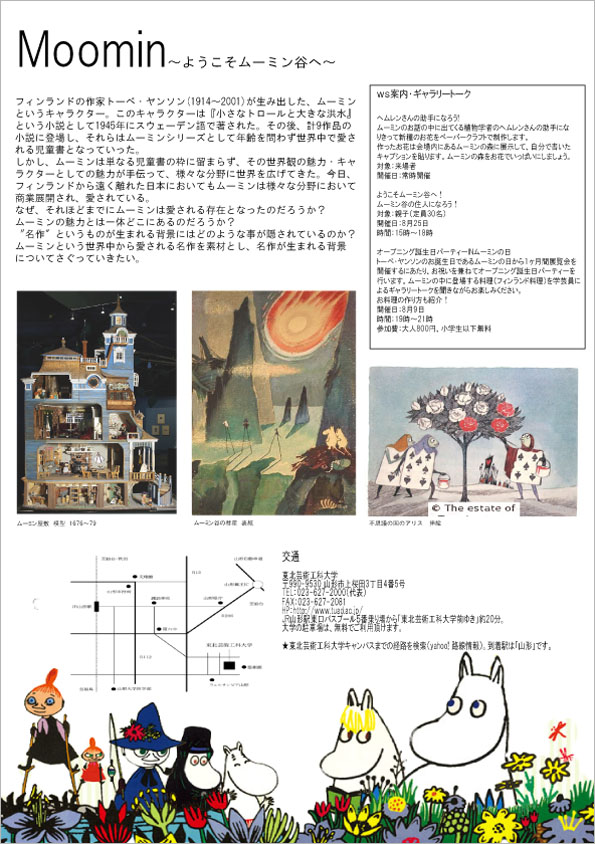 フィンランドの作家トーベ・ヤンソン(1914~2001)が生み出した、ムーミンというキャラクター。このキャラクターは『小さなトロールと大きな洪水』という小説として1945年にスウェーデン語で著された。その後、計9作品の小説に登場し、それらはムーミンシリーズとして年齢を問わず世界中で愛される児童書となっていった。なぜ、それほどまでにムーミンは愛される存在となったのだろうか?ムーミンの魅力とは一体どこにあるのだろうか?〝名作″というものが生まれる背景にはどのような事が隠されているのか?ムーミンという世界中から愛される名作を素材とし、名作が生まれる背景についてさぐっていきたい。
