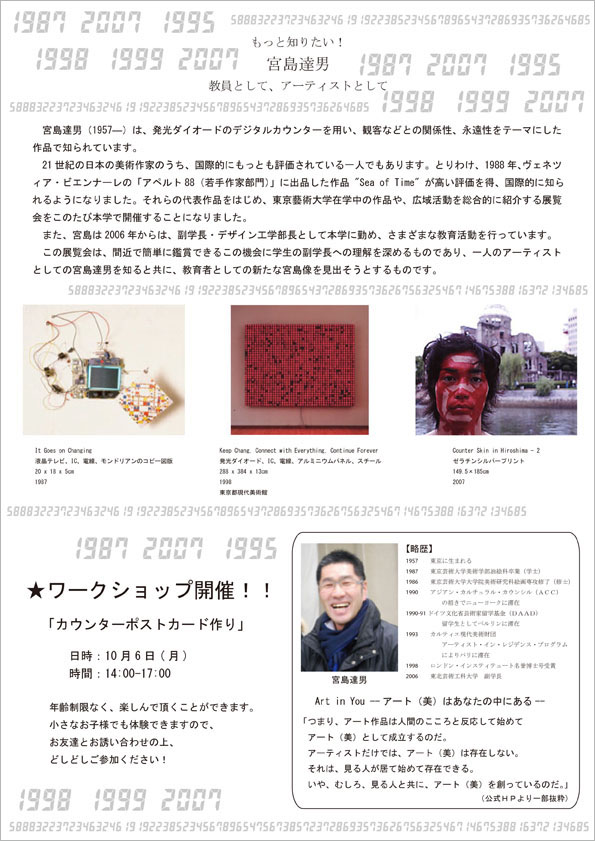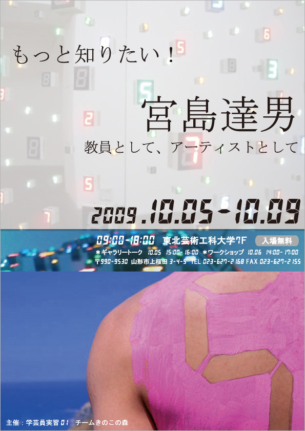 チームきのこの森本学副学長の宮島達男に迫る展覧会。教員として、アーティストとして、どのようなスタイルで生きてきたのか。本人へのロングインタビューを試み、DVDで編集して展示を行いました。
