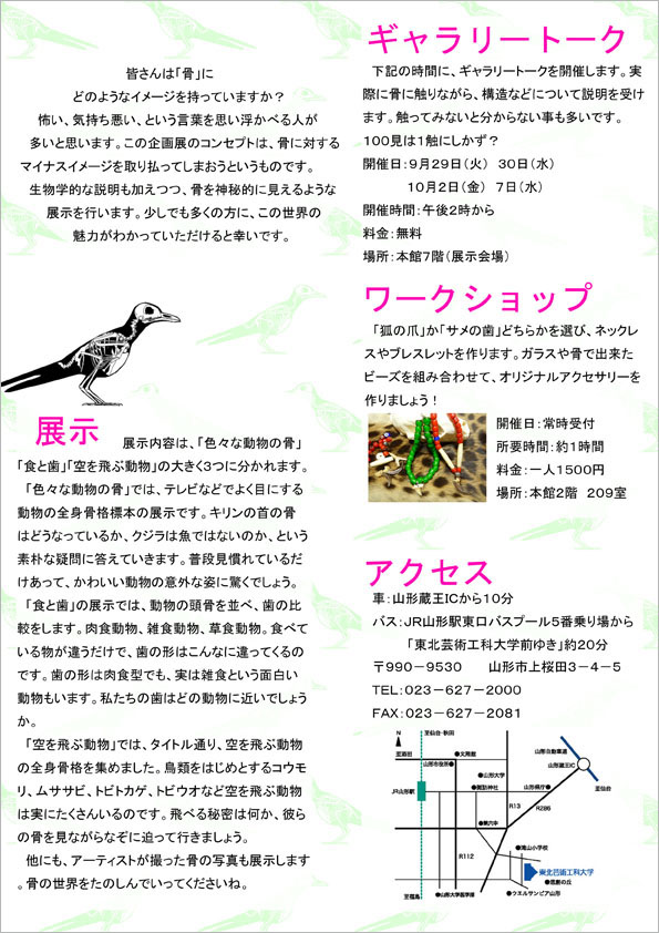 骨に対するイメージを変えてしまおうというコンセプトの展覧会。生物学的な説明をしながら、骨の神秘性に迫るものです。