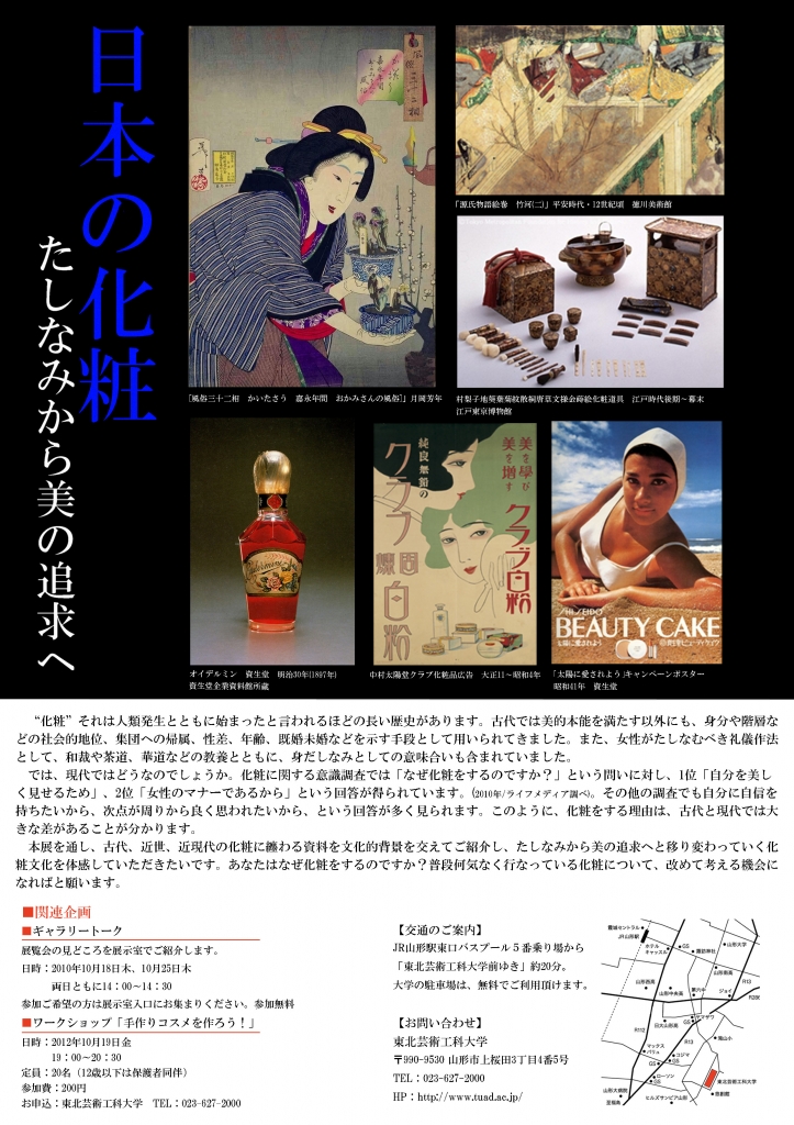 「化粧」。それは人類発生とともに始まったと言われるほどの長い歴史があります。古代では美的本能を満たす以外にも、身分や階層などの社会的地位、集団での帰属、性差、既婚未婚などを示す手段として用いられてきました。では現代ではどうでしょうか?化粧に関する意識調査では1位「自分を美しくみせるため」、2位「女性のマナーであるから」という回答が得られています(2010年・ライフメディア調べ)。普段何気なくおこなっている化粧について、改めて考える機会になればと願います。