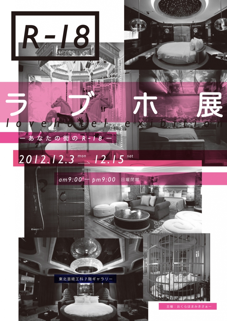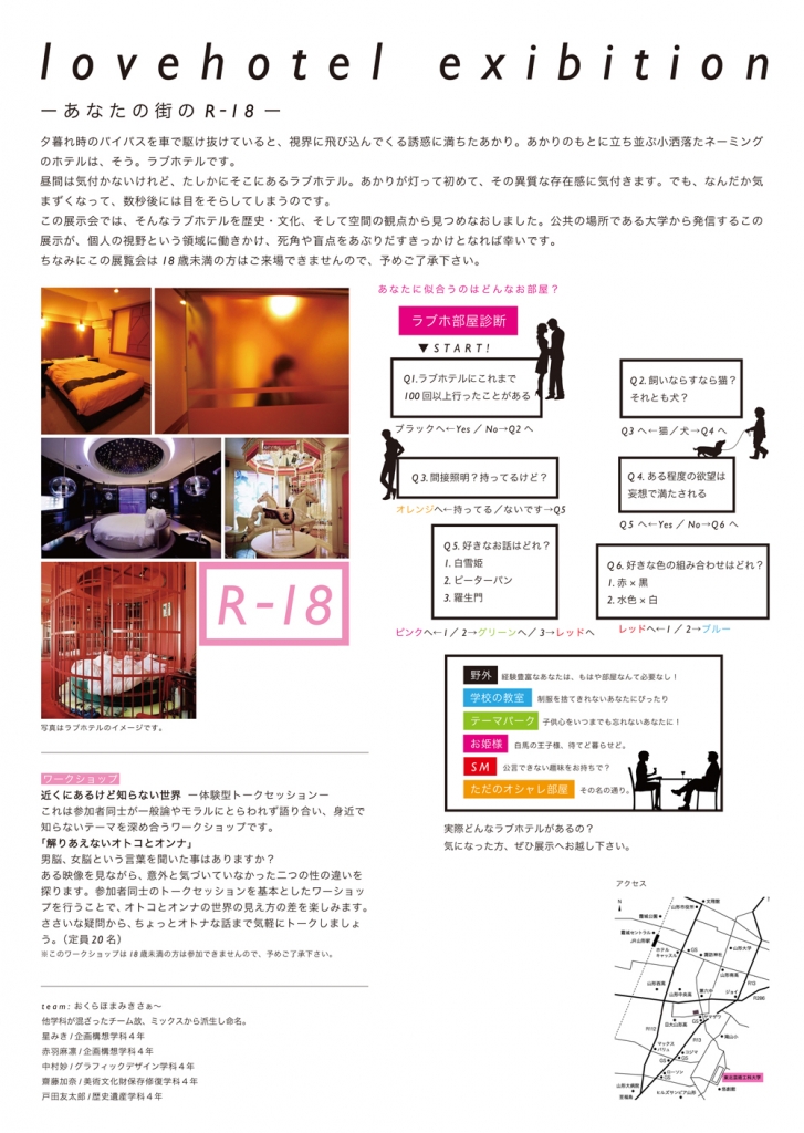 夕暮れ時のバイパスを車で駈け抜けていると、視界に飛び込んでくる誘惑に満ちたあかり。あかりのもとに立ち並ぶ小洒落たネーミングのホテルは、そう。ラブホテルです。昼間は気がつかないけれど、たしかにそこにあるホテル。あかりがともってはじめて、その異質な存在に気づきます。でも、なんだか気まずくなって、数秒後には目をそらしてしまうのです。この展覧会ではそんなラブホテルの歴史、文化、そして空間の観点から見つめなおしました。公共の場である大学から発信するこの展示が、個人の視野という領域に働きかけ、死角や盲点をあぶりだすきっかけとなれば幸いです。ちなみにこの展覧会は18歳未満の方のご来場はできませんのでご了承ください。