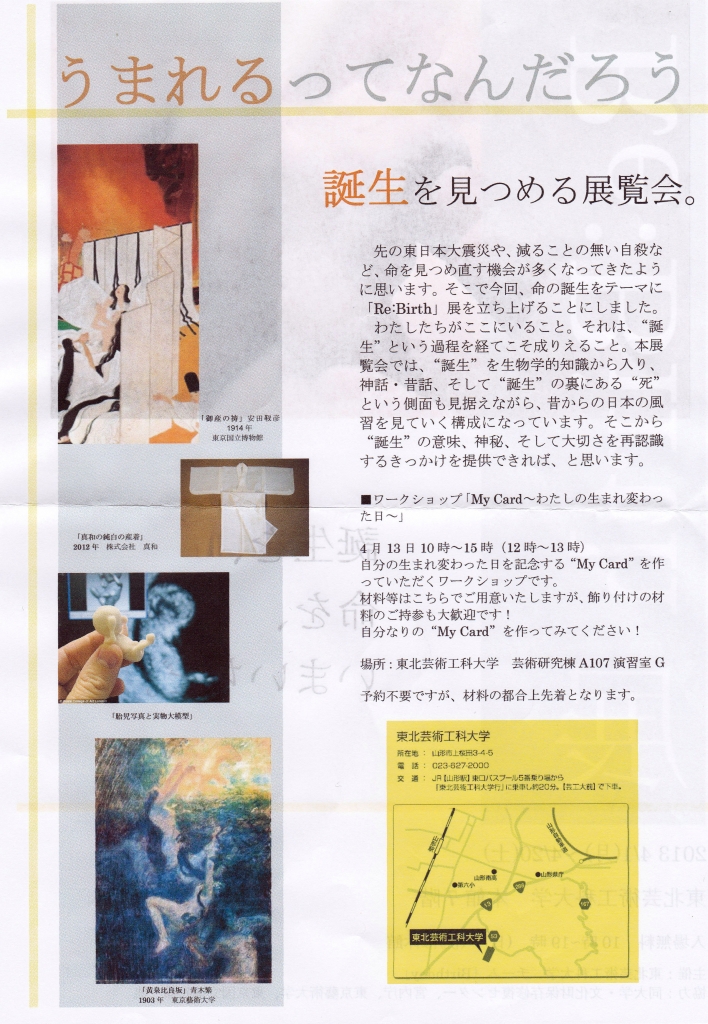 先の東日本大震災や、減ることの無い自殺など、命をみつめ直す機会が多くなっていたように思います。そこで今回、命の誕生をテーマに「Re:Birth」展を立ち上げることにしました。わたしたちがここにいること。それは「誕生」という過程を経てこそなりえること。本展覧会では「誕生」を生物学的知識から入り、神話・昔話、そして「誕生」の裏にある、「死」という側面も見据えながら、昔からの日本の風習をみていく構成になっています。そこから「誕生」の意味、神秘、そして大切さを再認識するきっかけを提供できれば、と思います。