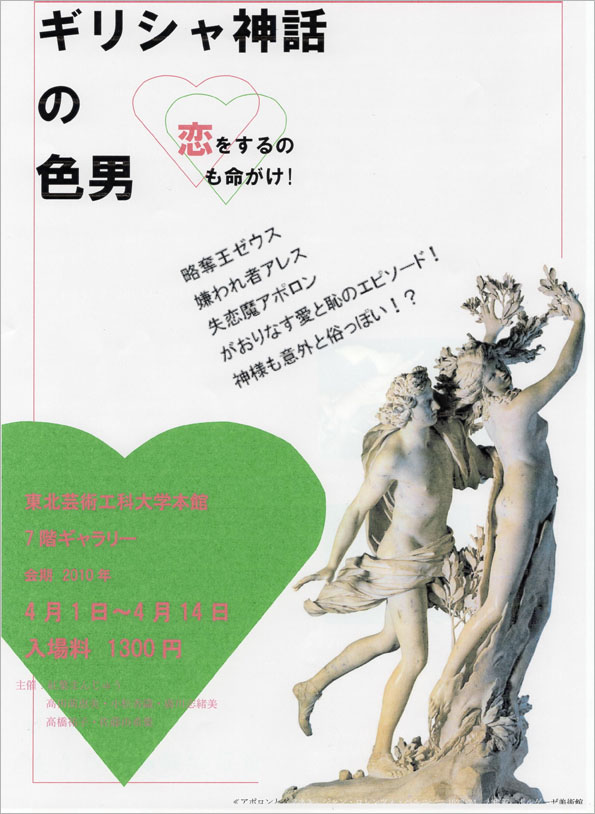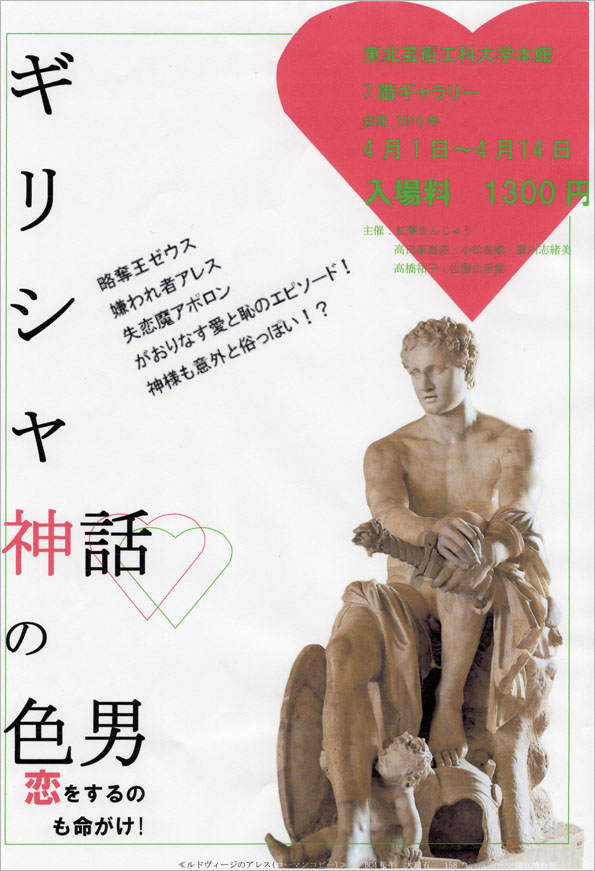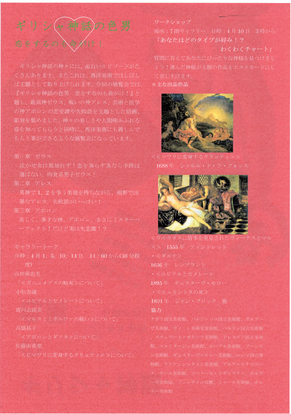 チーム紅葉まんじゅう略奪王ゼウス、嫌われ者アレス、失恋魔アポロン。ギリシャ神話に登場する神々が織りなす愛と恥のエピソード。神の美しさや人間味あふれる姿を通じ、西洋美術に親しみを持ってもらおうという企画です。