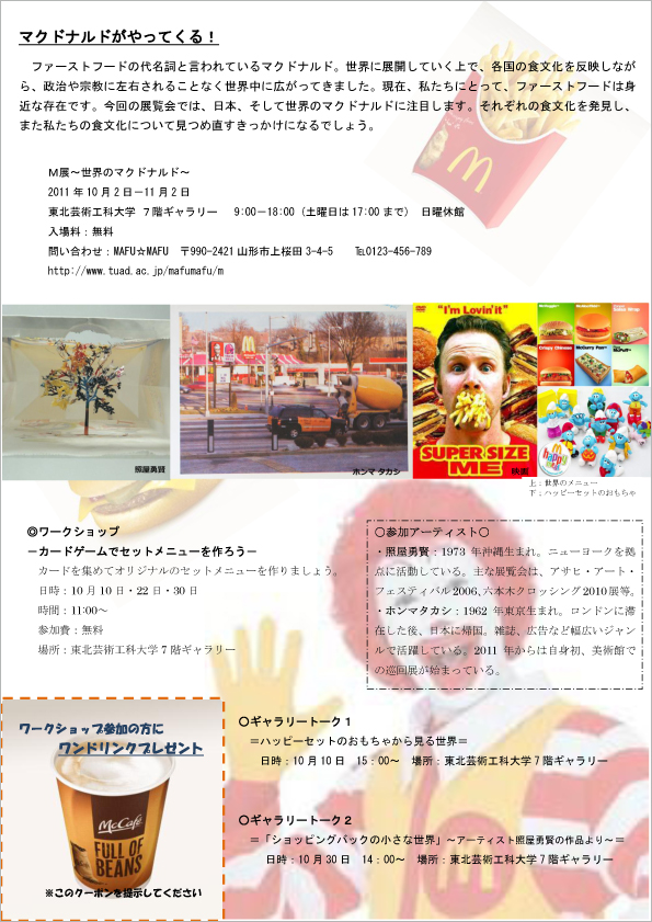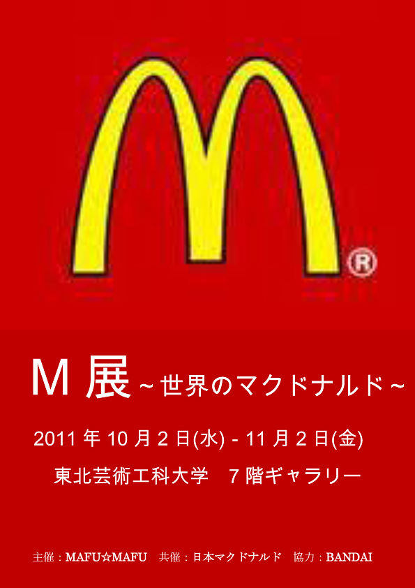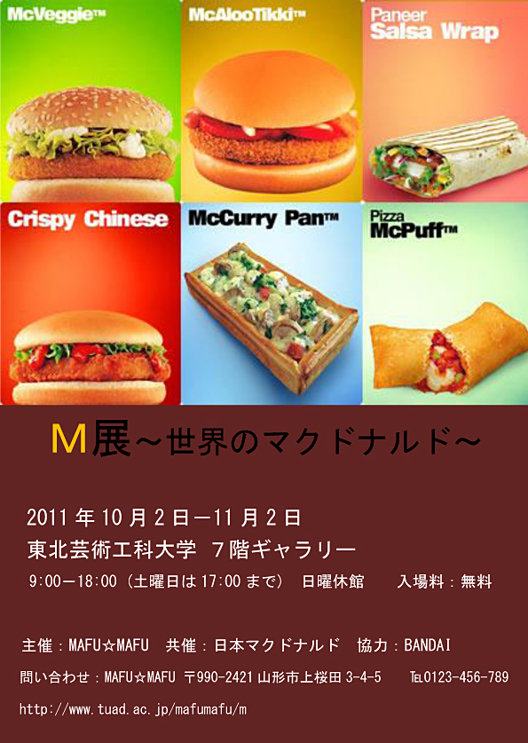 MAFU☆MAFUファーストフードの代名詞と言われているマクドナルド。世界に展開していく上で、各国の食文化を反映しながら、政治や宗教に左右されることなく世界中に広がってきました。現在、私たちにとって、ファーストフードは身近な存在です。今回の展覧会では、日本、そして世界のマクドナルドに注目します。それぞれの食文化を発見し、また私たちの食文化について見つめ直すきっかけになるでしょう。