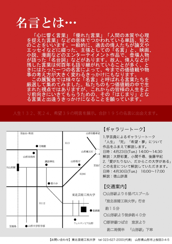 この展覧会では、展示を観た人がより前向きに生きてゆけるように「人生」、「死」、「夢・希望」の3つのテーマと、わが東北芸術工科大学理事長である徳山詳直氏の「名言」をそれぞれのゾーンで集めてみました。展示を見た人の新たな「はじまり」となる「名言」と出逢うきっかけになって欲しいと思っています。