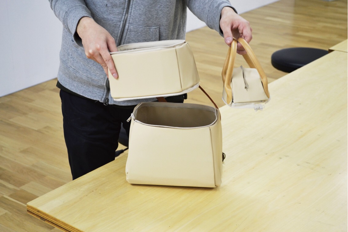 A:今回の提案では、三段に分割できる構造を持ったバッグを製作しています。この分割構造を用いることで既存の製品との差別化や収納性能、バッグの持ち運びやすさの向上を目指してます。